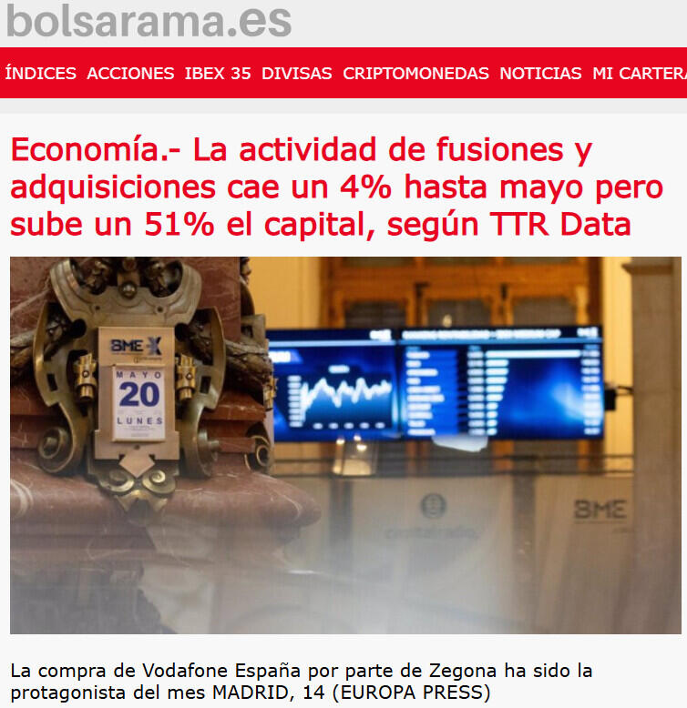 Economía.- La actividad de fusiones y adquisiciones cae un 4% hasta mayo pero sube un 51% el capital, según TTR Data