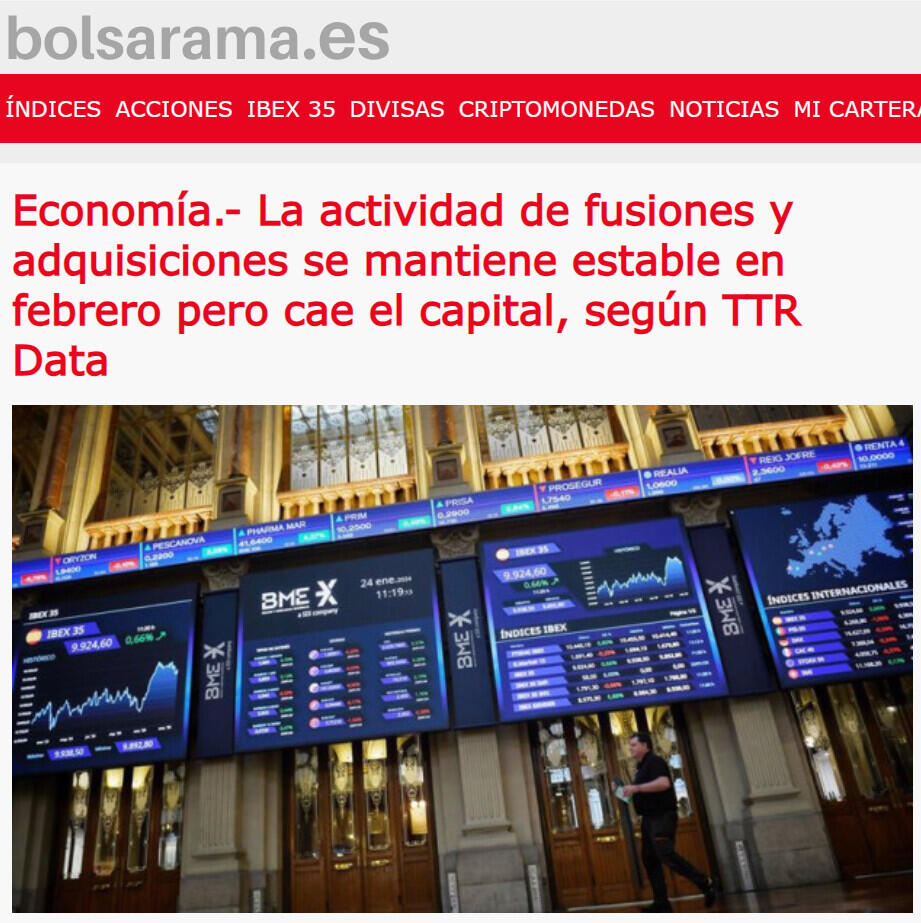 MADRID, 8 (EUROPA PRESS) El mercado transaccional español ha registrado hasta febrero un total de 447 acuerdos, lo que supone repetir el dato respecto al mismo periodo de 2023, según el informe mensual de TTR Data divulgado este viernes.