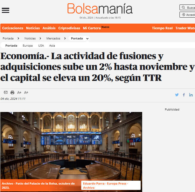 El mercado transaccional español ha registrado hasta noviembre un total de 2.939 acuerdos de fusiones y adquisiciones, lo que supone un ascenso del 2% respecto al mismo periodo de 2023, y, en paralelo, el importe de estas adquisiciones en lo que va de año ha sido de 89.764 millones de euros, un 20% más del capital movilizado en los once primeros meses de 2023, según el informe divulgado este miércoles por TTR Data.