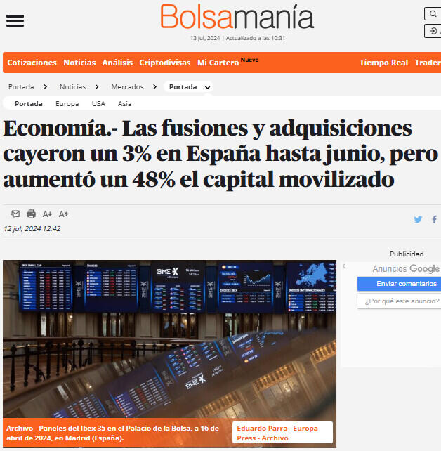 Economía.- Las fusiones y adquisiciones cayeron un 3% en España hasta junio, pero aumentó un 48% el capital movilizado