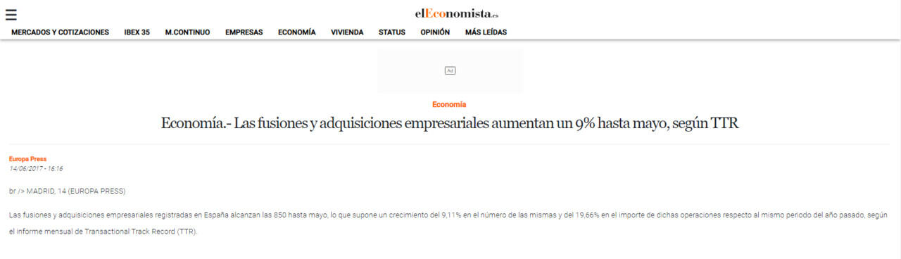 Las fusiones y adquisiciones empresariales registradas en España alcanzan las 850 hasta mayo, lo que supone un crecimiento del 9,11% en el número de las mismas y del 19,66% en el importe de dichas operaciones respecto al mismo periodo del año pasado, según el informe mensual de Transactional Track Record (TTR).