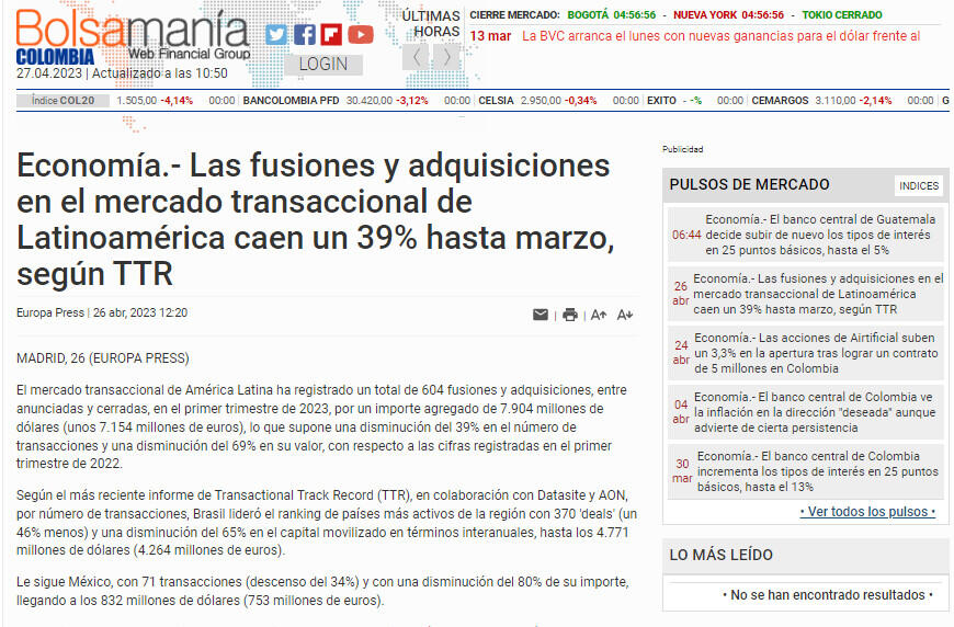 Economía.- Las fusiones y adquisiciones en el mercado transaccional de Latinoamérica caen un 39% hasta marzo, según TTR