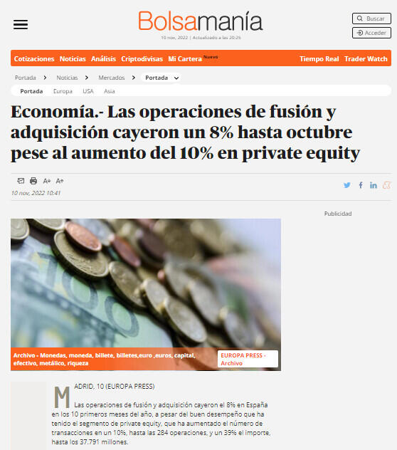 Las operaciones de fusión y adquisición cayeron el 8% en España en los 10 primeros meses del año, a pesar del buen desempeño que ha tenido el segmento de private equity, que ha aumentado el número de transacciones en un 10%, hasta las 284 operaciones, y un 39% el importe, hasta los 37.791 millones.