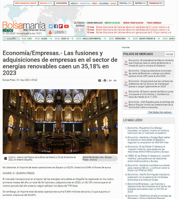 Economía/Empresas.- Las fusiones y adquisiciones de empresas en el sector de energías renovables caen un 35,18% en 2023