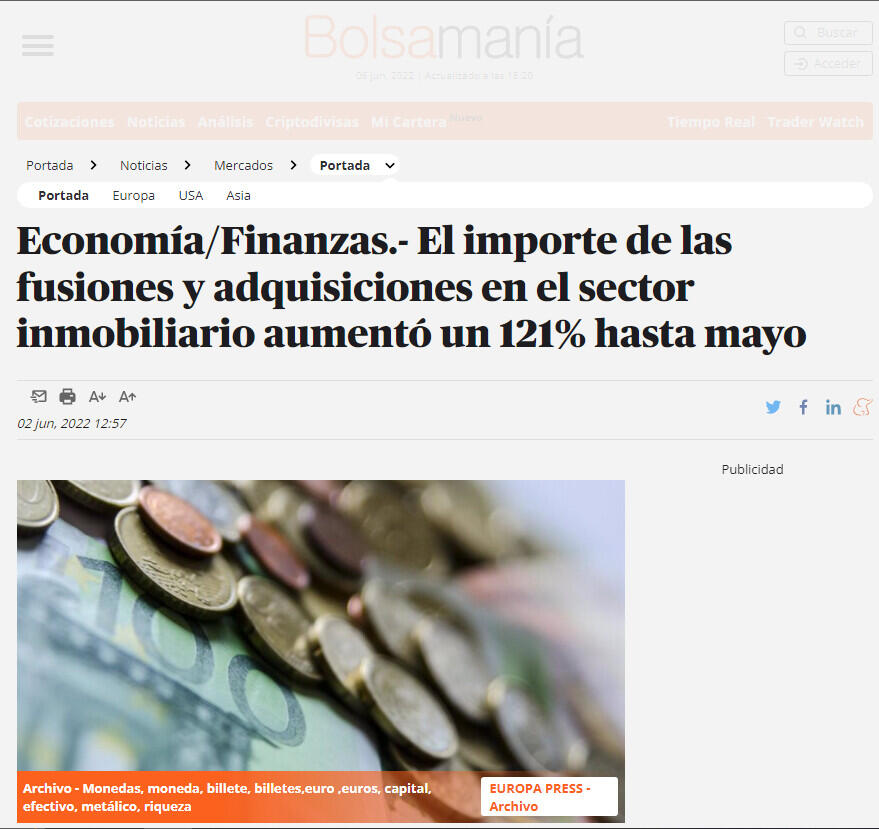 Economía/Finanzas.- El importe de las fusiones y adquisiciones en el sector inmobiliario aumentó un 121% hasta mayo