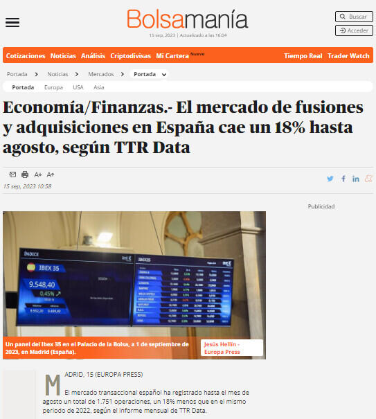 Economía/Finanzas.- El mercado de fusiones y adquisiciones en España cae un 18% hasta agosto, según TTR Data
