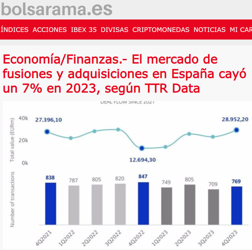 Economía/Finanzas.- El mercado de fusiones y adquisiciones en España cayó un 7% en 2023, según TTR Data