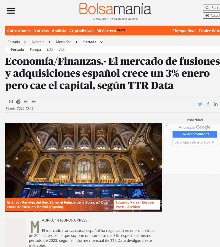 El informe de TTR DATA también publica los rankings de asesoramiento financiero y jurídico de 2024 en fusiones y adquisiciones, 'private equity', 'venture capital' y mercado de capitales, donde se informa de la actividad de las firmas destacadas por número de transacciones y por importe de las mismas.