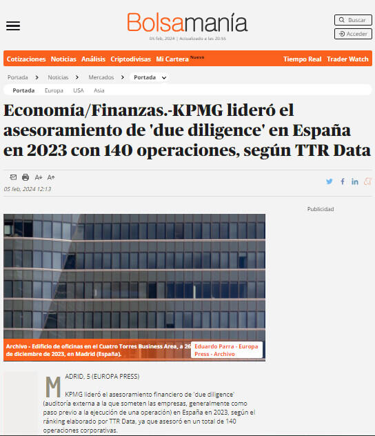 Economía/Finanzas.-KPMG lideró el asesoramiento de 'due diligence' en España en 2023 con 140 operaciones, según TTR Data