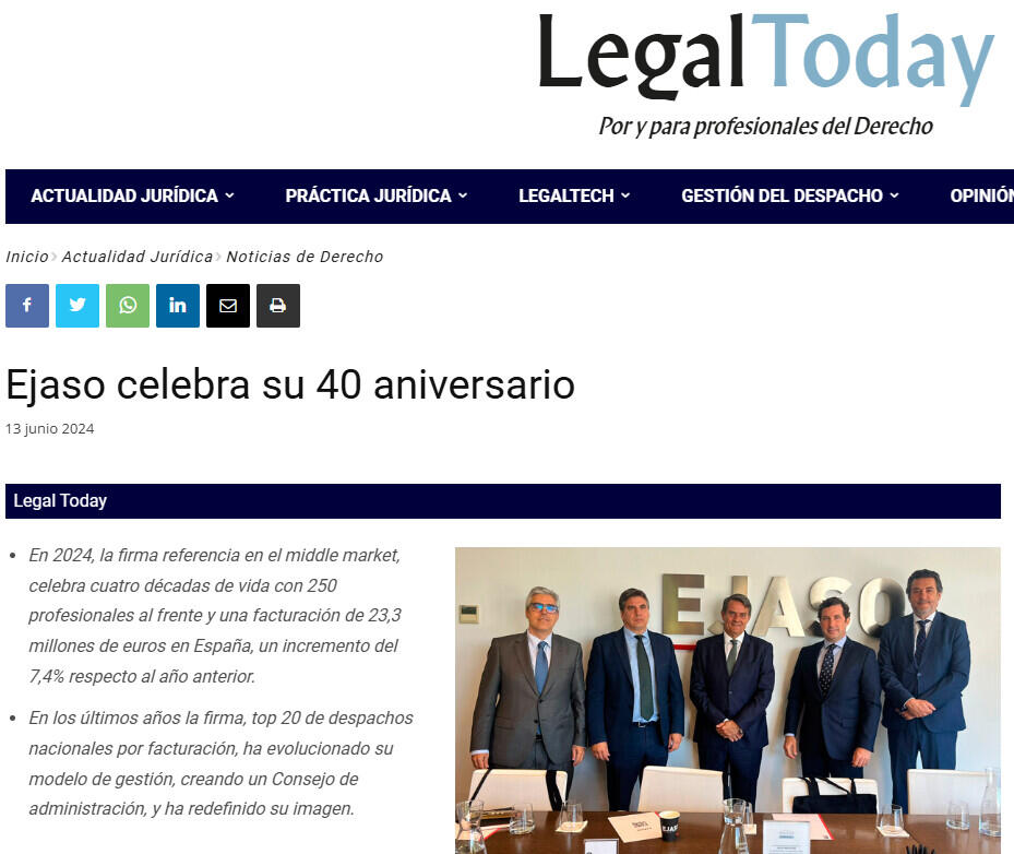 En 2024, Ejaso celebra sus 40 años de vida sumando 250 profesionales y una facturación de 23,6 millones de euros (España y Portugal), lo que representa un incremento del 7,4% respecto al año anterior y que sitúa a la firma en el top 20 de despachos nacionales por facturación. Este crecimiento constante y la ambiciosa apuesta de la firma por el crecimiento y la especialización ha permitido al despacho duplicar su volumen de negocio en tan solo siete años. Eso sí, Juan Enrique Altimis, socio director del área Fiscal, destaca que no se trata únicamente de alcanzar una cifra de negocio, se trata también “de mejorar la rentabilidad,lograda a través de la tecnología, una optimización de la gestión del conocimiento, la formación y la especialización”.