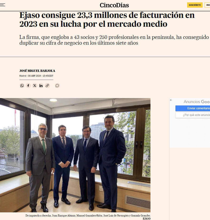 Ejaso, el despacho español especializado en la abogacía de los negocios del mercado medio, ha reportado unos ingresos de 23,3 millones de euros en 2023. Con ello, la firma consigue duplicar su cifra de negocio en los últimos siete años, según reportan fuentes del bufete. Estos números, valoran en la firma, revalidan el éxito del comité de socios que desde el 2021 dirige la firma, compuesto por Manuel González-Haba, José Luis de Navasqüés, Gonzalo Grandes y Juan Enrique Altimis.