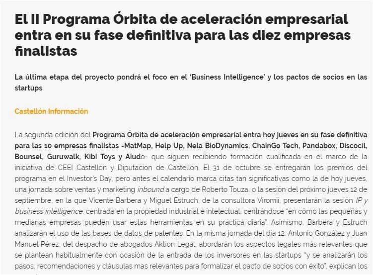 La segunda edición del Programa Órbita de aceleración empresarial entra hoy jueves en su fase definitiva para las 10 empresas finalistas -MatMap, Help Up, Nela BioDynamics, ChainGo Tech, Pandabox, Discocil, Bounsel, Guruwalk, Kibi Toys y Aiudo- que siguen recibiendo formación cualificada en el marco de la iniciativa de CEEI Castellón y Diputación de Castellón. El 31 de octubre se entregarán los premios del programa en el Investor’s Day, pero antes el calendario marca citas tan significativas como la de hoy jueves, una jornada sobre ventas y marketing inbound a cargo de Roberto Touza, o la sesión del próximo jueves 12 de septiembre, en la que Vicente Barbera y Miguel Estruch, de la consultora Viromii, presentarán la sesión IP y business intelligence, centrada en la propiedad industrial e intelectual, centrándose “en cómo las pequeñas y medianas empresas pueden usar estas herramientas en su práctica diaria”. Asimismo, Barbera y Estruch analizarán el uso de las bases de datos de patentes. En la misma jornada del dia 12, Antonio González y Juan Manuel Pérez, del despacho de abogados Aktion Legal, abordarán los aspectos legales más relevantes que se plantean habitualmente con ocasión de la entrada de los inversores en las startups “y se analizarán los pasos, recomendaciones y cláusulas mas relevantes para formalizar el pacto de socios con éxito”, explican los ponentes.
