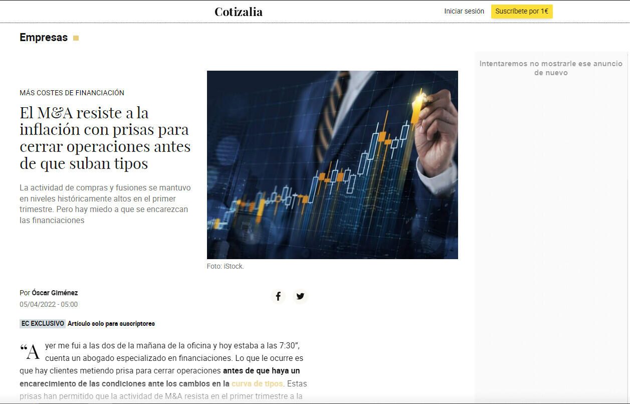 “Ayer me fui a las dos de la mañana de la oficina y hoy estaba a las 7:30”, cuenta un abogado especializado en financiaciones. Lo que le ocurre es que hay clientes metiendo prisa para cerrar operaciones antes de que haya un encarecimiento de las condiciones ante los cambios en la curva de tipos. Estas prisas han permitido que la actividad de M&A resista en el primer trimestre a la inflación y a la incertidumbre por los efectos de la guerra de Ucrania.