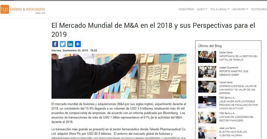 En el mercado peruano se registraron, durante el 2018, un total de 155 operaciones, con un importe no confidencial, de aproximadamente, US$9,133 millones, un 85% mayor al monto registrado en el 2017, según la empresa Transactional Track Record (TTR). En el Perú los sectores con mayor actividad, durante el año pasado, fueron: sector financiero, minería, alimentos y distribución y retail. El deal de mayor monto tuvo como target a la Empresa de Generación Huallaga (Central Hidroeléctrica Chaglla), adquirida por China Three Gorges Corporation por más de USD 600 millones.En un reciente informe el Banco de Inversión J.P.Morgan, señala que a nivel global durante el 2019 se espera que el mercado de M&A esté influenciado por la asignación de los excedentes de caja de las corporaciones norteamericanas (resultado de la reforma fiscal) a la compra de empresas y una mayor participación de fuentes alternativas de capital como: los fondos soberanos, family office, fondos de capital privado, generando mayor competencia e impulsando al alza los valores de las empresas.