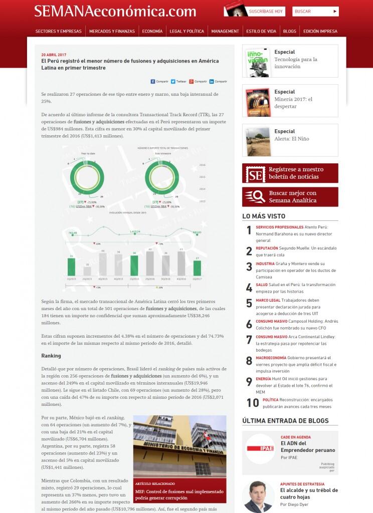 De acuerdo al último informe de la consultora Transactional Track Record (TTR), las 27 operaciones de fusiones y adquisiciones efectuadas en el Perú representaron un importe de US$984 millones. Esta cifra es menor en 30% al capital movilizado del primer trimestre del 2016 (US$1,413 millones).