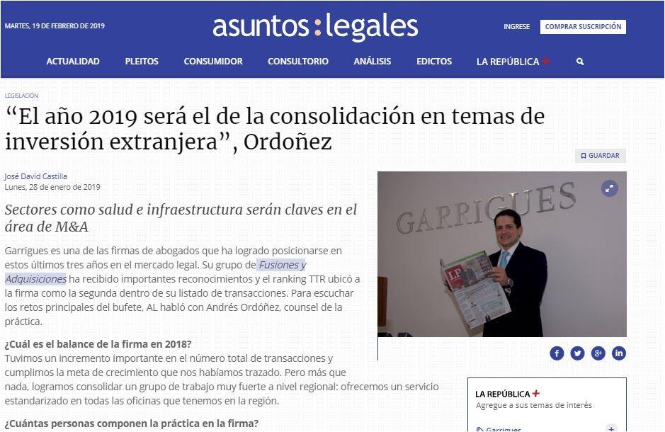 Garrigues es una de las firmas de abogados que ha logrado posicionarse en estos últimos tres años en el mercado legal. Su grupo de Fusiones y Adquisiciones ha recibido importantes reconocimientos y el ranking TTR ubicó a la firma como la segunda dentro de su listado de transacciones. Para escuchar los retos principales del bufete, AL habló con Andrés Ordóñez, counsel de la práctica.