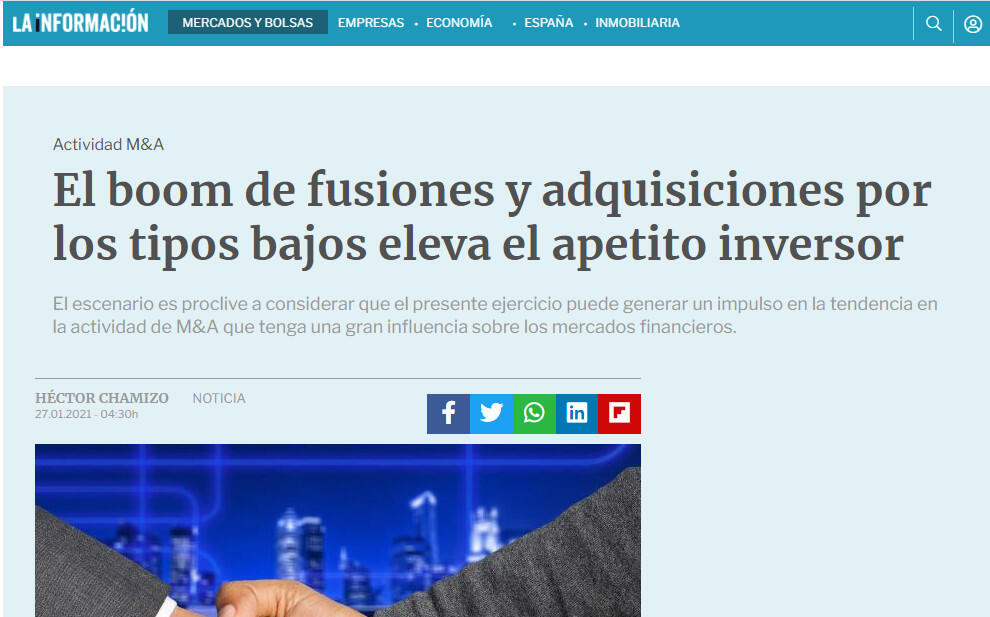 Cabría esperar que en 2021 las operaciones de fusiones o adquisiciones vayan de menos a más, como se observó en el pasado. Como consecuencia de esos excesos de liquidez que se atisban en los fondos de capital riesgo que son conocedores que, ante un panorama como el actual, el dinero hay que ponerlo a funcionar. Es momento de capitalizar y obtener rentabilidades de este entorno.