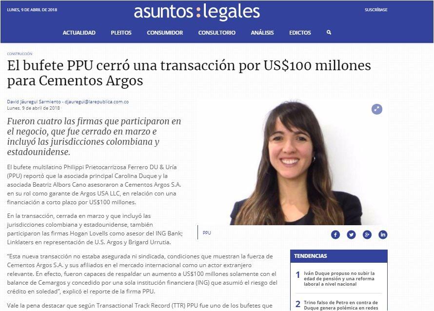 El bufete multilatino Philippi Prietocarrizosa Ferrero DU & Uría (PPU) reportó que la asociada principal Carolina Duque y la asociada Beatriz Albors Cano asesoraron a Cementos Argos S.A. en su rol como garante de Argos USA LLC, en relación con una financiación a corto plazo por US$100 millones.