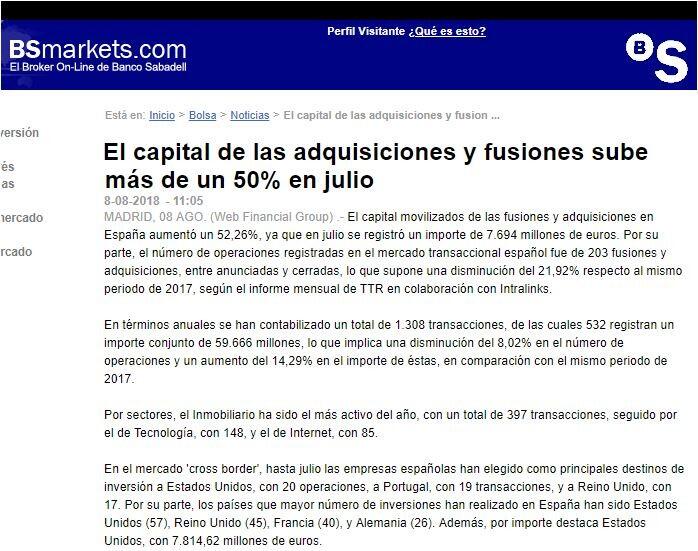 El capital movilizados de las fusiones y adquisiciones en España aumentó un 52,26%, ya que en julio se registró un importe de 7.694 millones de euros. Por su parte, el número de operaciones registradas en el mercado transaccional español fue de 203 fusiones y adquisiciones, entre anunciadas y cerradas, lo que supone una disminución del 21,92% respecto al mismo periodo de 2017, según el informe mensual de TTR en colaboración con Intralinks.