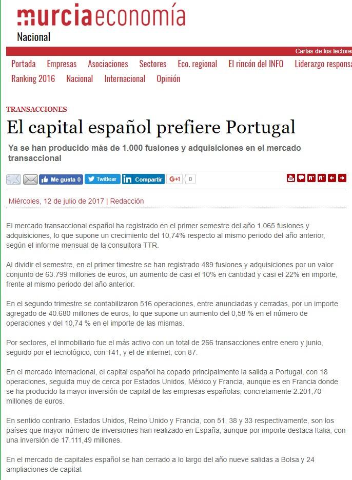En el mercado internacional, el capital español ha copado principalmente la salida a Portugal, con 18 operaciones, seguida muy de cerca por Estados Unidos, México y Francia, aunque es en Francia donde se ha producido la mayor inversión de capital de las empresas españolas, concretamente 2.201,70 millones de euros.