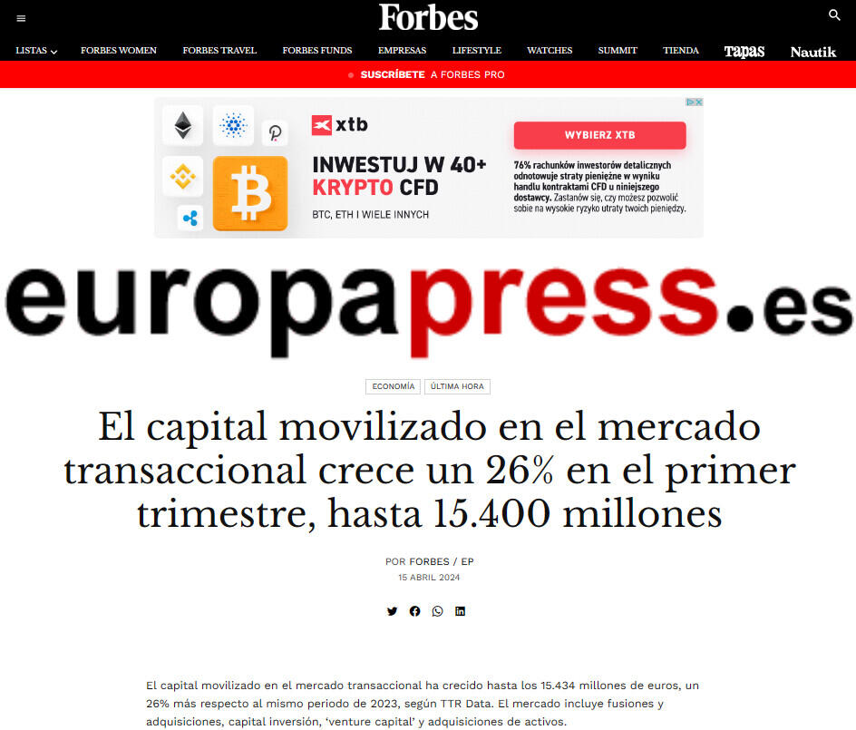 El capital movilizado en el mercado transaccional ha crecido hasta los 15.434 millones de euros, un 26% más respecto al mismo periodo de 2023, según TTR Data. El mercado incluye fusiones y adquisiciones, capital inversión, ‘venture capital’ y adquisiciones de activos.