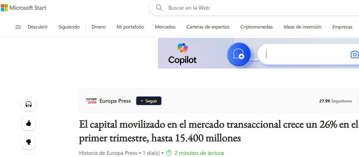 El capital movilizado en el mercado transaccional crece un 26% en el primer trimestre, hasta 15.400 millones