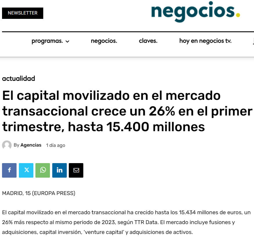 El capital movilizado en el mercado transaccional ha crecido hasta los 15.434 millones de euros, un 26% más respecto al mismo periodo de 2023, según TTR Data. El mercado incluye fusiones y adquisiciones, capital inversión, ‘venture capital’ y adquisiciones de activos.