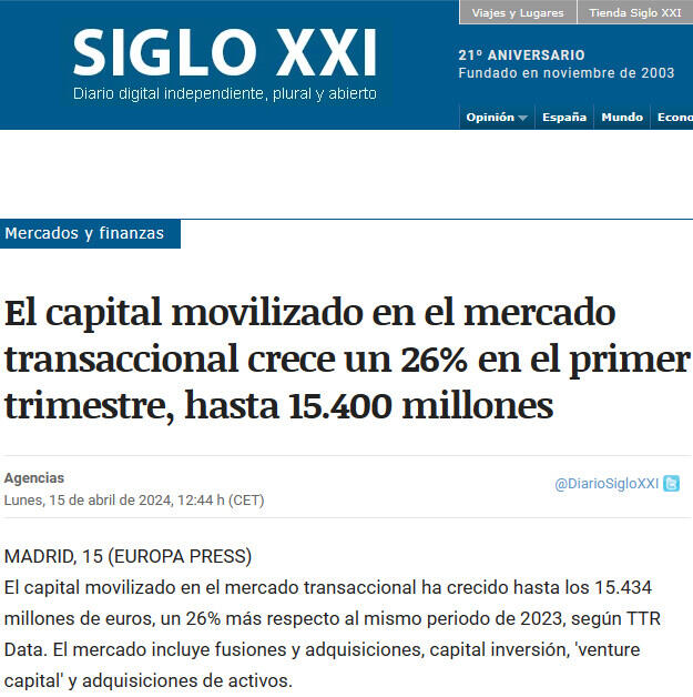 El capital movilizado en el mercado transaccional ha crecido hasta los 15.434 millones de euros, un 26% más respecto al mismo periodo de 2023, según TTR Data. El mercado incluye fusiones y adquisiciones, capital inversión, 'venture capital' y adquisiciones de activos.