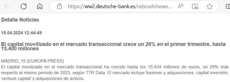 El capital movilizado en el mercado transaccional ha crecido hasta los 15.434 millones de euros, un 26% más respecto al mismo periodo de 2023, según TTR Data. El mercado incluye fusiones y adquisiciones, capital inversión, 'venture capital' y adquisiciones de activos.