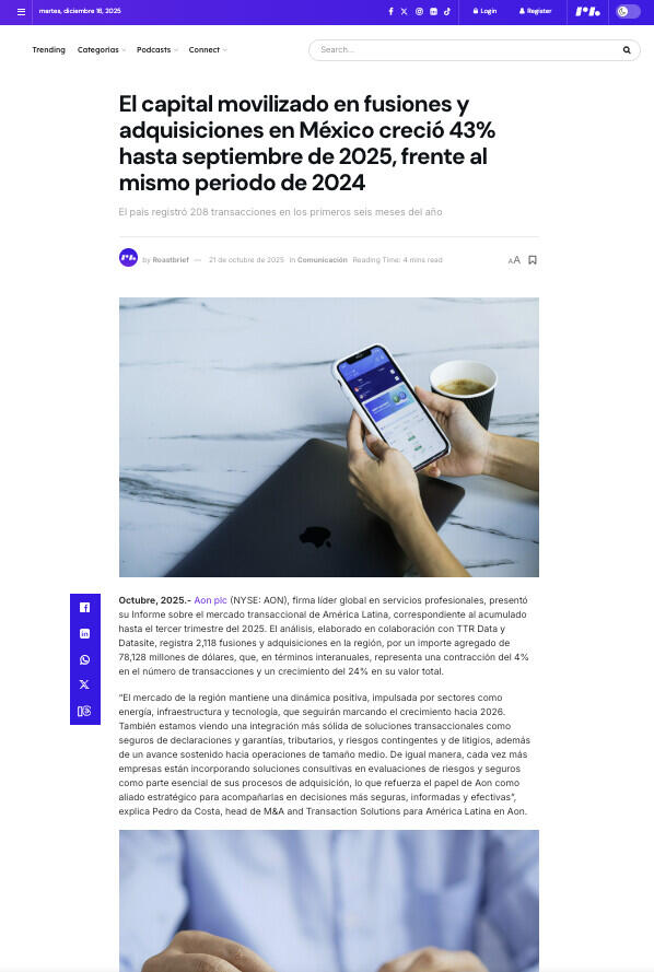 “El mercado de la región mantiene una dinámica positiva, impulsada por sectores como energía, infraestructura y tecnología, que seguirán marcando el crecimiento hacia 2026. También estamos viendo una integración más sólida de soluciones transaccionales como seguros de declaraciones y garantías, tributarios, y riesgos contingentes y de litigios, además de un avance sostenido hacia operaciones de tamaño medio. De igual manera, cada vez más empresas están incorporando soluciones consultivas en evaluaciones de riesgos y seguros como parte esencial de sus procesos de adquisición, lo que refuerza el papel de Aon como aliado estratégico para acompañarlas en decisiones más seguras, informadas y efectivas”, explica Pedro da Costa, head de M&A and Transaction Solutions para América Latina en Aon.