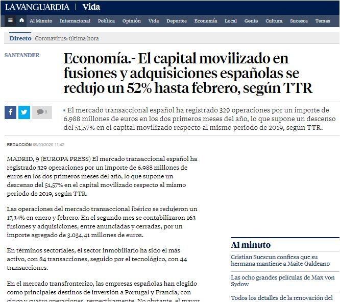 El capital movilizado en fusiones y adquisiciones españolas se redujo un 52% hasta febrero, según TTR