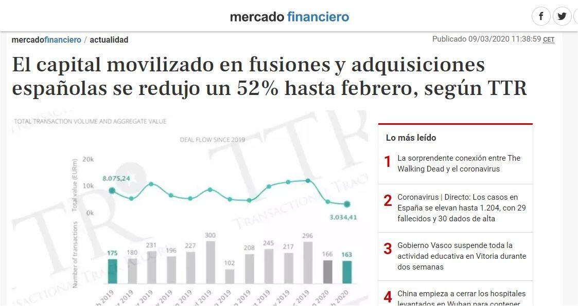 El capital movilizado en fusiones y adquisiciones españolas se redujo un 52% hasta febrero, según TTR