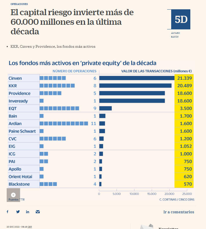 Los fondos internacionales han sido los auténticos reyes de esta etapa. De acuerdo a los registros de este mismo informe, Cinven ha sido el fondo que más ha invertido en el mercado español en esta década, con 21.000 millones, teniendo en cuenta las transacciones cerradas hasta el 31 de octubre y sin incluir las compras de activos y las joint ventures. Le sigue muy de cerca KKR con 20.000 millones y Providence con 18.000 millones