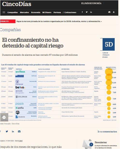 En pleno confinamiento, mientras las Bolsas se hundían y el paro se disparaba, más de medio centenar de emprendedores españoles siguieron adelante con sus campañas de financiación y consiguieron cerrarlas con éxito; algunas, como en el caso de Wallbox, por sumas bastante respetables. Según Transactional Track Record (TTR), desde el inicio del estado de alarma (14 de marzo), 67 startups han completado rondas de capital riesgo por un total de 126 millones de euros.