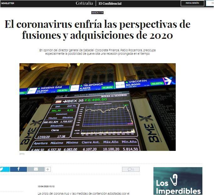 Para Rocamora, la situación provocará una caída en el volumen de fusiones y adquisiciones a corto plazo, como muestra que, por ejemplo, se hayan detenido las transacciones que todavía estaban en proceso en el mes de febrero.