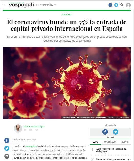El coronavirus hunde un 35% la entrada de capital privado internacional en Espaņa