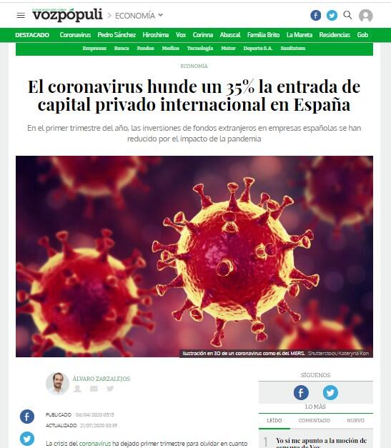 El coronavirus hunde un 35% la entrada de capital privado internacional en Espaņa