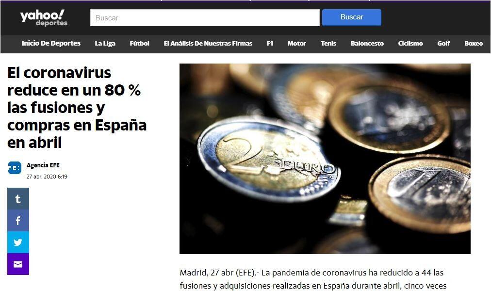 El coronavirus reduce en un 80 % las fusiones y compras en Espaņa en abril