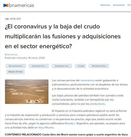 El impacto en la industria petrolera regional no será uniforme y la industria de exploración y producción y servicios para campos petroleros podría sentir las consecuencias mientras no comiencen a recuperarse los precios, algo que podría ocurrir recién hacia fines de año, según la agencia calificadora Moody's. Argentina, por ejemplo, se prepara para una actividad más débil en Vaca Muerta.