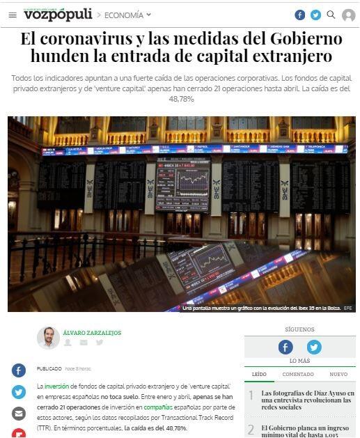 Marcela Chacón Sierra, portavoz del área de Research and Business Intelligence (RBI) de TTR, apunta a la crisis del coronavirus y a las medidas proteccionistas aprobadas por el Ejecutivo como las principales variables que explican estos números. “La caída del 48% en la actividad transaccional de 'private equity' y 'venture capital' en el transcurso de 2020 refleja un indicador relevante para el futuro de las transacciones crossborder en España", explica a este diario al tiempo que apunta que esta caída ha sido especialmente fuerte a lo largo de abril.