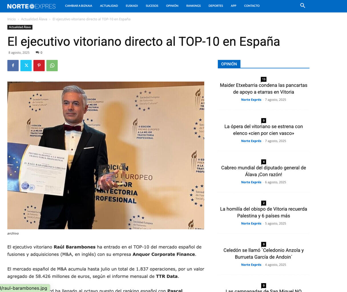 El ejecutivo vitoriano Raúl Barambones ha entrado en el TOP-10 del mercado español de fusiones y adquisiciones (M&A, en inglés) con su empresa Anquor Corporate Finance.