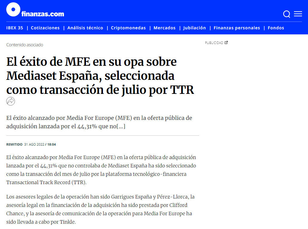 El éxito alcanzado por Media For Europe (MFE) en la oferta pública de adquisición lanzada por el 44,31% que no controlaba de Mediaset España ha sido seleccionado como la transacción del mes de julio por la plataforma tecnológico-financiera Transactional Track Record (TTR).
