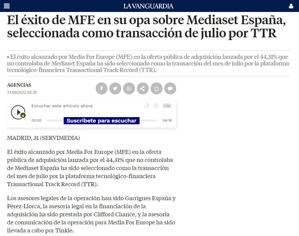 El éxito alcanzado por Media For Europe (MFE) en la oferta pública de adquisición lanzada por el 44,31% que no controlaba de Mediaset España ha sido seleccionado como la transacción del mes de julio por la plataforma tecnológico-financiera Transactional Track Record (TTR).