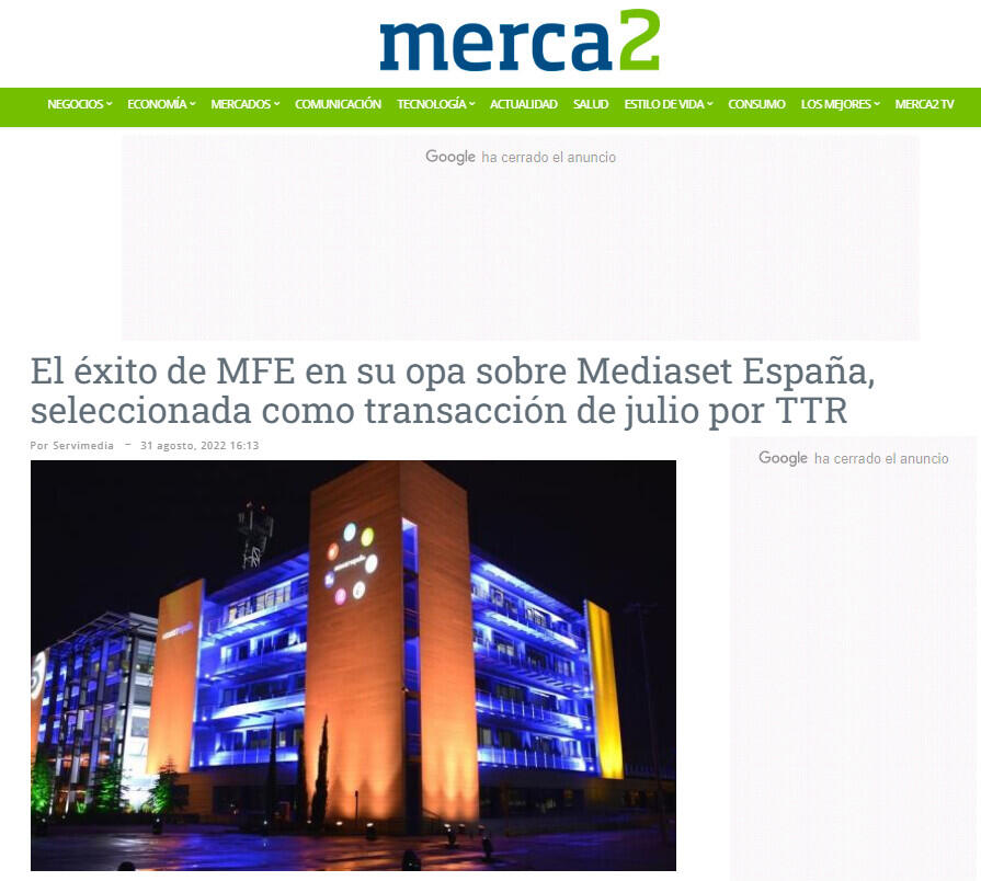 El éxito de MFE en su opa sobre Mediaset España, seleccionada como transacción de julio por TTR