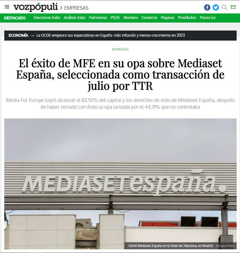 El éxito alcanzado por Media For Europe (MFE) en la oferta pública de adquisición lanzada por el 44,31% que no controlaba de Mediaset España ha sido seleccionado como la transacción del mes de julio por la plataforma tecnológico-financiera Transactional Track Record (TTR). Los asesores legales de la operación han sido Garrigues España y Pérez-Llorca, la asesoría legal en la financiación de la adquisición ha sido prestada por Clifford Chance, y la asesoría de comunicación de la operación para Media For Europe ha sido llevada a cabo por Tinkle.