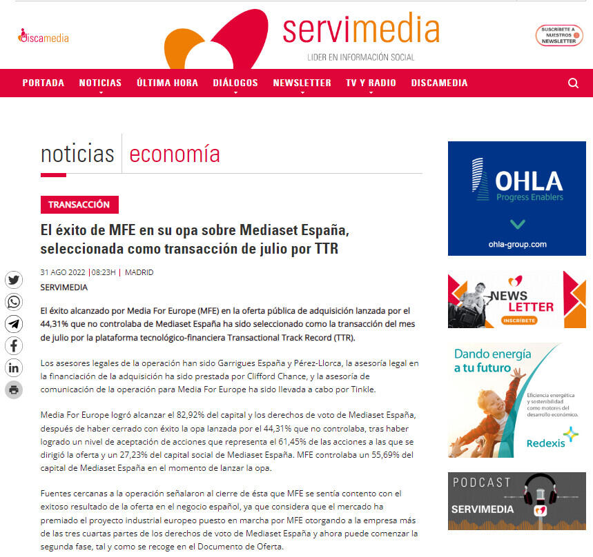 El éxito de MFE en su opa sobre Mediaset España, seleccionada como transacción de julio por TTR