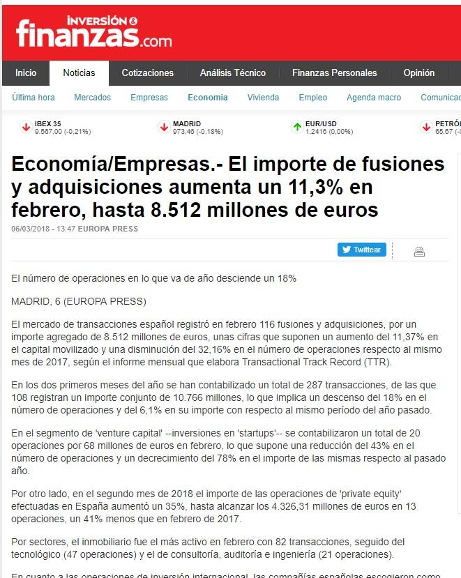 El mercado de transacciones español registró en febrero 116 fusiones y adquisiciones, por un importe agregado de 8.512 millones de euros, unas cifras que suponen un aumento del 11,37% en el capital movilizado y una disminución del 32,16% en el número de operaciones respecto al mismo mes de 2017, según el informe mensual que elabora Transactional Track Record (TTR).