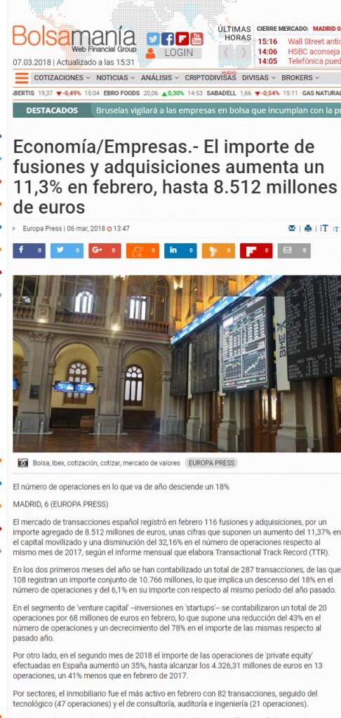 El mercado de transacciones español registró en febrero 116 fusiones y adquisiciones, por un importe agregado de 8.512 millones de euros, unas cifras que suponen un aumento del 11,37% en el capital movilizado y una disminución del 32,16% en el número de operaciones respecto al mismo mes de 2017, según el informe mensual que elabora Transactional Track Record (TTR).