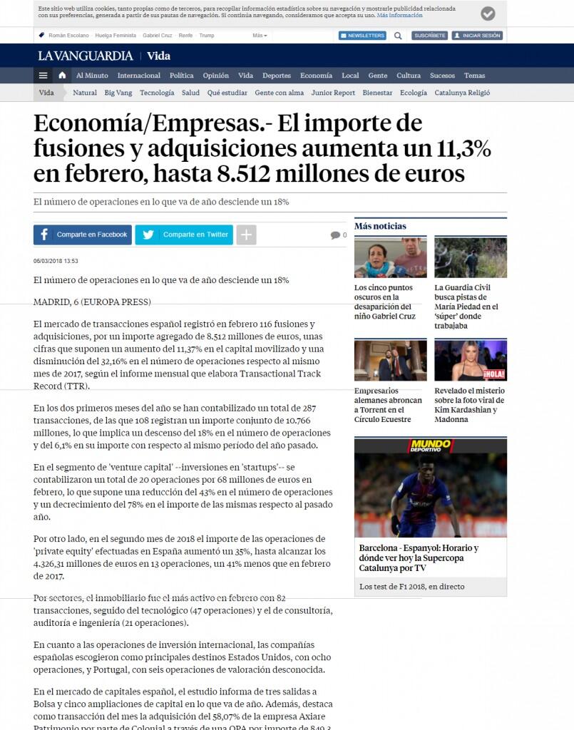 El mercado de transacciones español registró en febrero 116 fusiones y adquisiciones, por un importe agregado de 8.512 millones de euros, unas cifras que suponen un aumento del 11,37% en el capital movilizado y una disminución del 32,16% en el número de operaciones respecto al mismo mes de 2017, según el informe mensual que elabora Transactional Track Record (TTR).