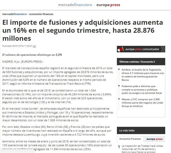 El mercado de transacciones español registró en el segundo trimestre de 2018 un total de 535 fusiones y adquisiciones, por un importe agregado de 28.876 millones de euros, unas cifras que suponen un aumento del 16% en el capital movilizado, pero una disminución del 6,8% en el número de operaciones respecto al mismo periodo de 2017, según el informe trimestral de Transactional Track Record (TTR).